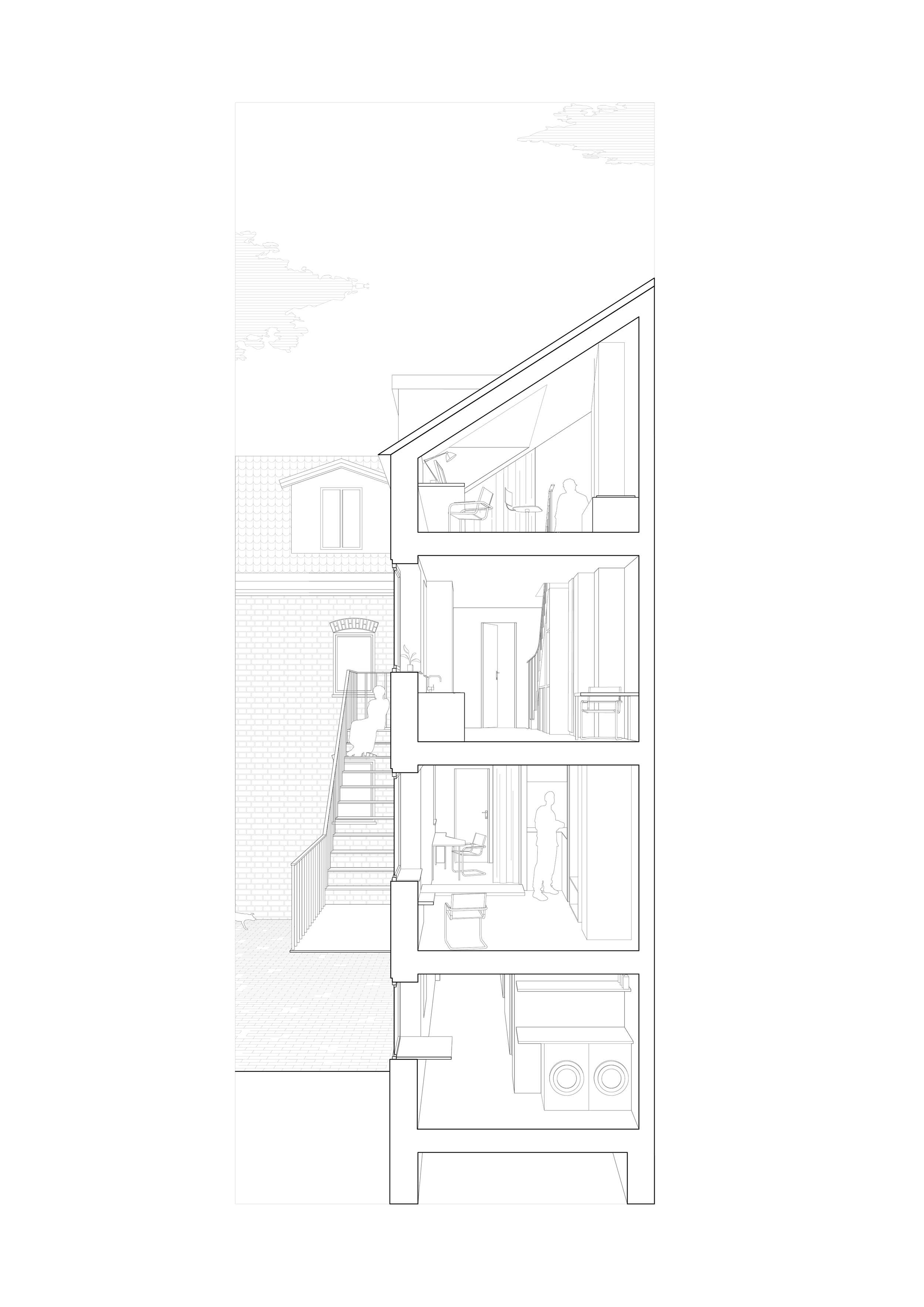 I dette projekt har vi transformeret et ubenyttet smalt baghus på Vestre Stationsvej i Odense, for at gøre brug af eksisterende kvadratmetre. Bebyggelsen er blevet transformeret om til to boliger, hvor vi i kælderen har placeret et fælles vaskeri, som kan benyttes af hele bebyggelsen. I fortsættelse af at gøre bedst brug af eksisterende arealer, har vi tegnet en flot udvendige trappe som også kan bruges til ophold.